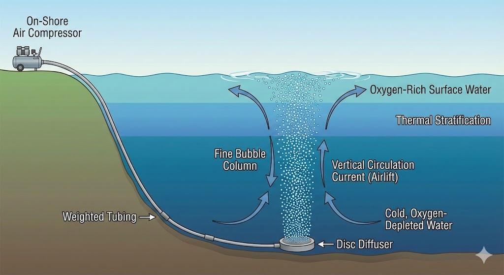 Sådan fungerer det: Når boblerne stiger, skaber de en "løftende" effekt kaldet en luftløft. Dette trækker iltfattigt vand fra bunden til overfladen for at interagere med atmosfæren og effektivt bryde termisk lagdeling og iltning af hele vandsøjlen.