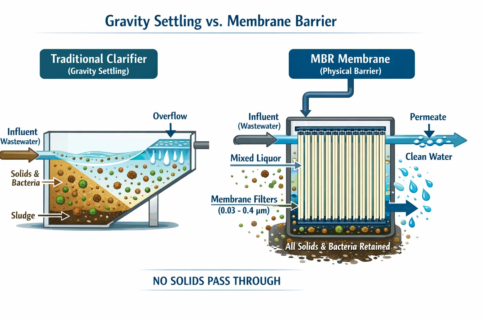 I et konventionelt anlæg er du begrænset af, hvor hurtigt en partikel kan synke. I en MBR bruger vi en fysisk membranbarriere (typisk 0,03 til 0,4 μm).